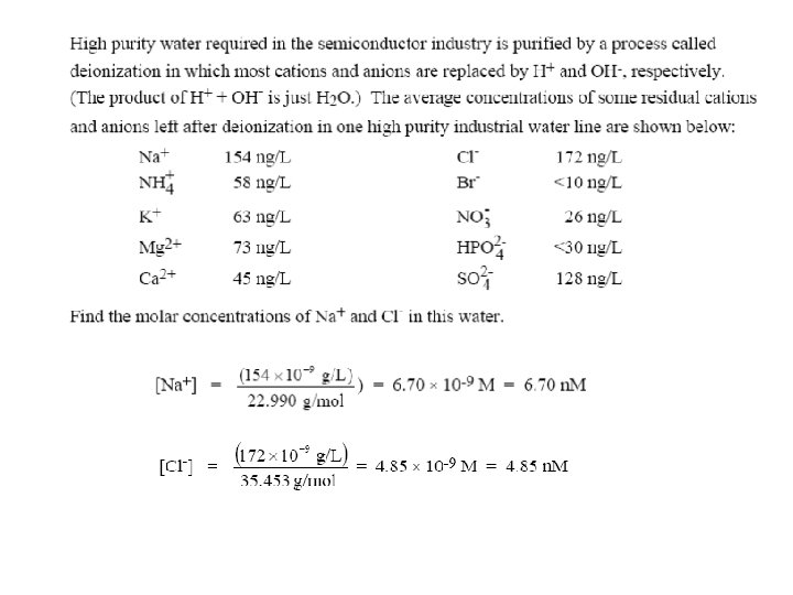 1 -2 Chemical concentrations (Continued) Molarity and Molality: Molarity (M) is the number of moles of a substance per liter of solution. Molality (m) is concentration expressed as moles of a substance per kilogram of solvent. Problem 1 -14. What is the formal concentration (expressed as mol/L = M) of Na. Cl when 32. 0 g are dissolved in water and diluted to 0. 500 L? Answer: The molecular mass of Na. Cl is 58. 44 g/mol The moles of sale in 32. 0 g are 32. 0 g /58. 44(g/mol) = ……