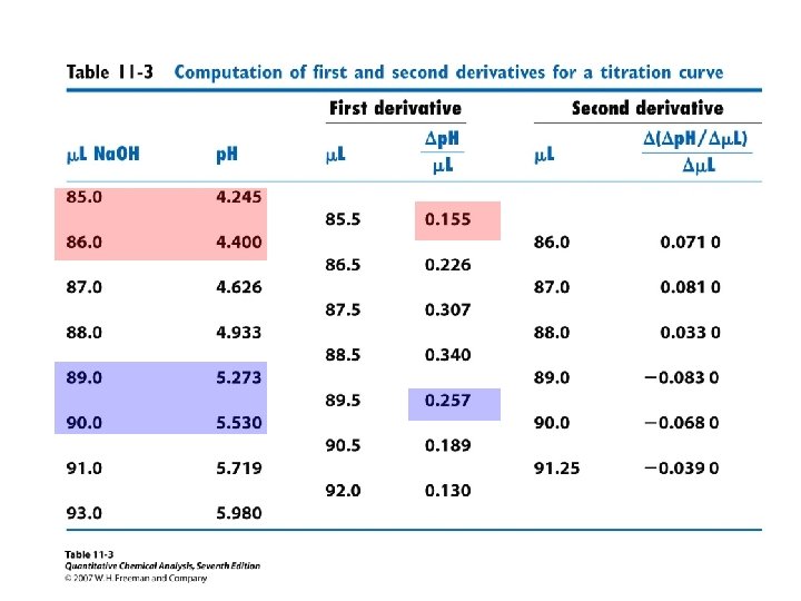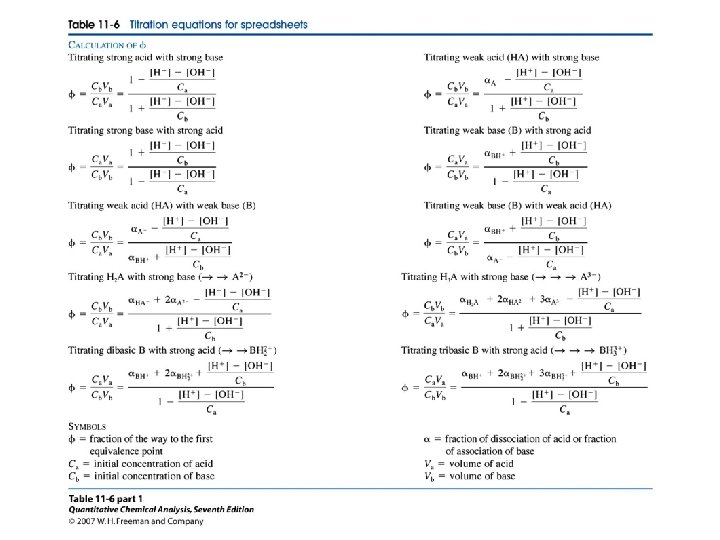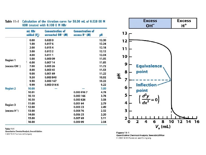 11 -1 Titration of strong base with strong acid • In the titration of any strong base with any strong acid, H+ + OH- → H 2 O there are three regions of the titration curve that require different kinds of calculations: 1. Before the equivalence point, the p. H is determined by excess OH− in the solution. 2. At the equivalence point, H+ is just sufficient to react with all OH− to make H 2 O. The p. H is determined by dissociation of water. 3. After the equivalence point, p. H is determined by excess H+ in the solution.
