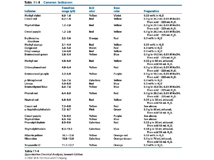 11 -6 Finding the end point with indicators • Indicator itself is an acid or base whose various protonated species have different colors. • The p. H range over which indicator changes its color is called the transition range. • The difference between the observed end point (color change) and the true equivalence point is called the indicator error. • In general, one seeks an indicator whose transition range overlaps the steepest part of the titration curve as closely as possible.