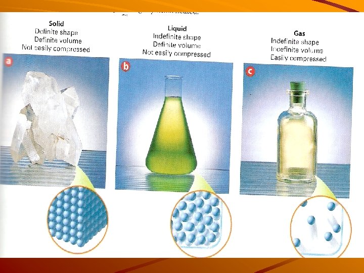 States of Matter States of matter are also called “phases of matter” & are characteristic of substances Three states are solid, liquid & gas 1. solid is matter with definite shape & composition 2. liquid is matter without shape (takes the shape of its container) , flows & has definite volume 3. gas is matter without shape or volume & takes the shape of its container while expanding to fill the volume