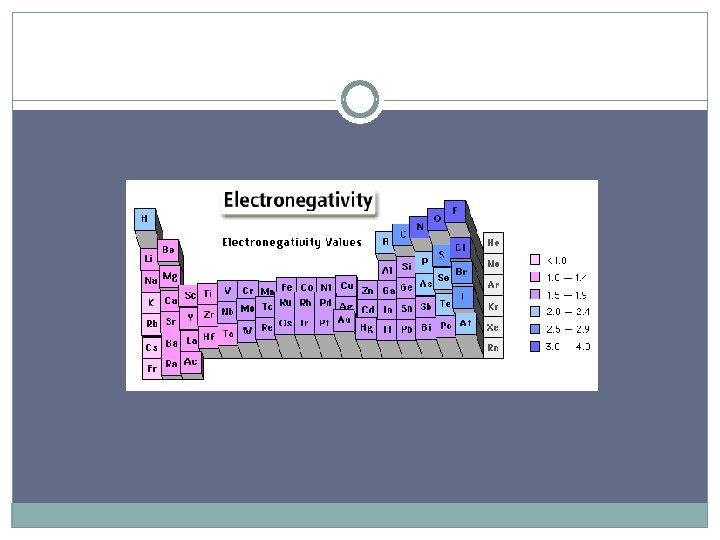 Electronegativity A measure of the ability of an atom in a chemical compound to attract electrons Electronegativities tend to increase across a period * more positive charges in the nucleus to attract more elctrons Electronegativities tend to decrease down a group or remain the same * additional energy levels result in less attraction to the nucleus