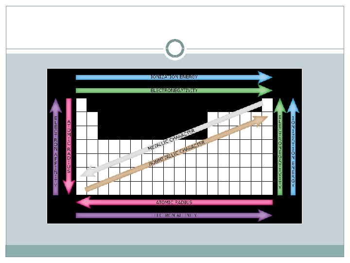 Ionization Energy - the energy required to remove an electron from an atom Increases for successive electrons taken from the same atom Tends to increase across a period Increased number of protons and electrons leads to greater attraction Tends to decrease down a group Outer electrons are farther from the nucleus
