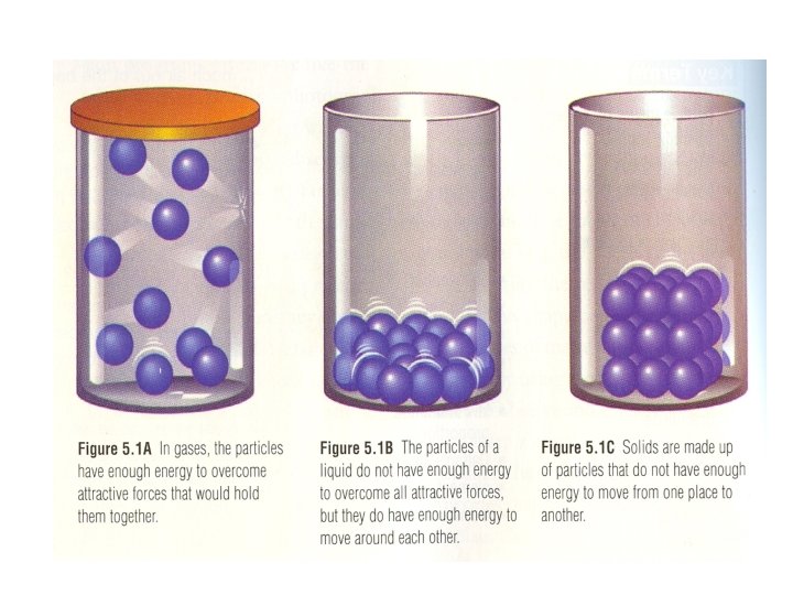 Liquids • The particles in a liquid are close, but not as close as in a solid. • The particles can slide past each other because they are less attracted to each other. • A liquid takes the shape of its container. And example is pop in a can or juice in a glass.