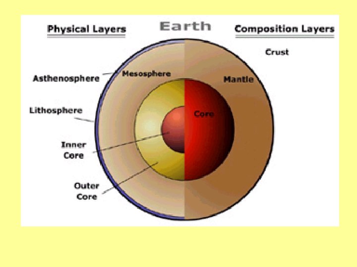 Segregation of elements: gravitational force Compositionally distinct layers Physically distinct layers Remember: the liquid outer core with the Earth’s rotation produces the magnetic field.