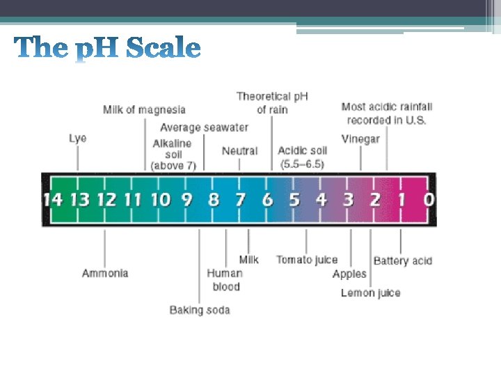 • p. H is a numerical scale used to determine the strength or weakness of an acid or base. • The p. H scale runs from 0 to 14 – Acids are below 7; strong acids are near 0. – Bases are above 7; strong bases near 14. - Neutral solutions have a p. H of 7.
