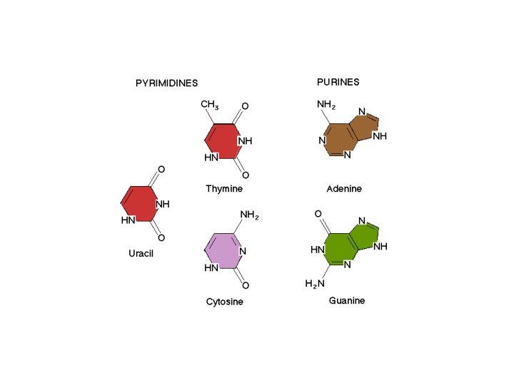 Nucleic Acids • composed of monomer units known as nucleotides. • The main functions of nucleotides are information storage (DNA), protein synthesis (RNA), energy transfers (ATP and NAD), and signaling molecules (c. AMP) • Nucleotides consist of a sugar, a nitrogenous base, and a phosphate.
