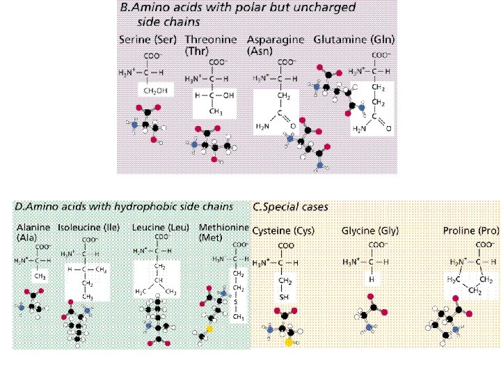 • Each amino acid has specific properties Leucine (Leu) HYDROPHOBIC Figure 3. 12 B Serine (Ser) Cysteine (Cys) HYDROPHILIC