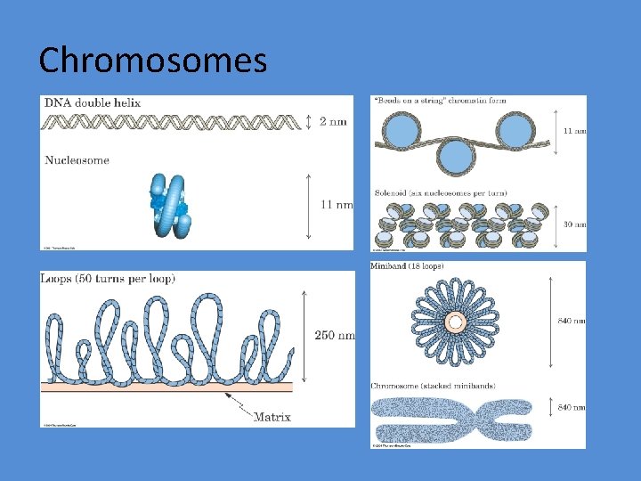 Higher structure of DNA – DNA is coiled around proteins called histones. – Histones are rich in the basic amino acids Lys and Arg, whose side chains have a positive charge. – The negatively-charged DNA molecules and positivelycharged histones attract each other and form units called nucleosomes. – Nucleosome: a core of eight histone molecules around which the DNA helix is wrapped. – Nucleosomes are further condensed into chromatin. – Chromatin fibers are organized into loops, and the loops into the bands that provide the superstructure of chromosomes.