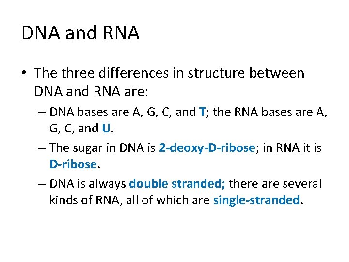 DNA and RNA • The three differences in structure between DNA and RNA are: – DNA bases are A, G, C, and T; the RNA bases are A, G, C, and U. – The sugar in DNA is 2 -deoxy-D-ribose; in RNA it is D-ribose. – DNA is always double stranded; there are several kinds of RNA, all of which are single-stranded.