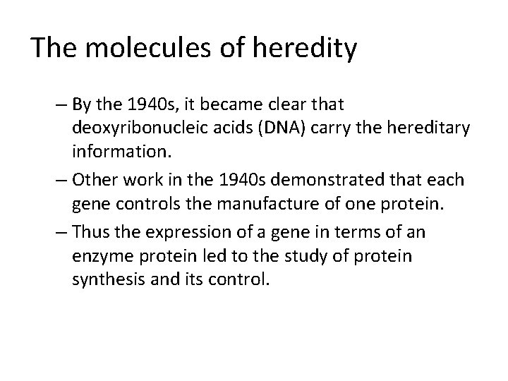 The molecules of heredity – By the 1940 s, it became clear that deoxyribonucleic acids (DNA) carry the hereditary information. – Other work in the 1940 s demonstrated that each gene controls the manufacture of one protein. – Thus the expression of a gene in terms of an enzyme protein led to the study of protein synthesis and its control.