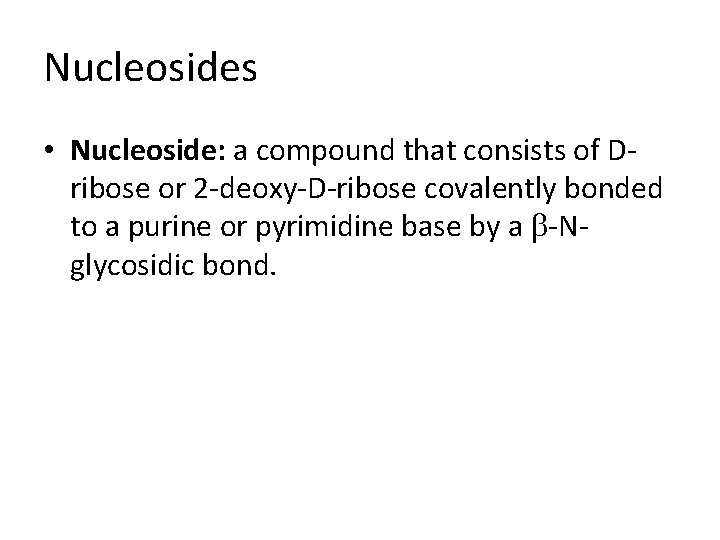 Nucleosides • Nucleoside: a compound that consists of Dribose or 2 -deoxy-D-ribose covalently bonded to a purine or pyrimidine base by a -Nglycosidic bond.