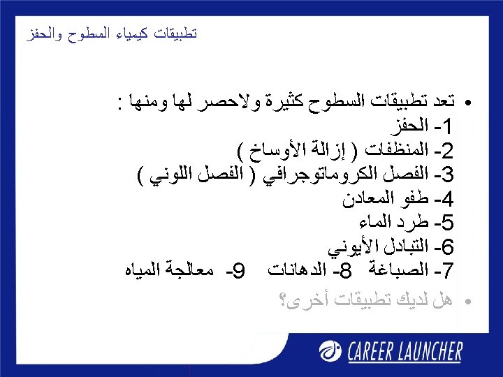 Surface Chemistry in Important Technologies § § § Surface Chemistry in Pharmacy Surface Chemistry in Food and Feed Surface Chemistry in Detergency Surface Chemistry in Agriculture Surface and Colloid Chemistry in Photographic Technology Surface Chemistry in Paints Surface Chemistry of Paper Surface Chemistry in the Polymerization of Emulsion Colloidal Processing of Ceramics Surface Chemistry in Dispersion, Flocculation and Flotation Surface Chemistry in the Petroleum Industry