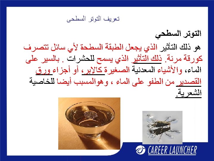 Surface Tension as a Force Ø caused by the attraction between the molecules of the liquid by various intermolecular forces