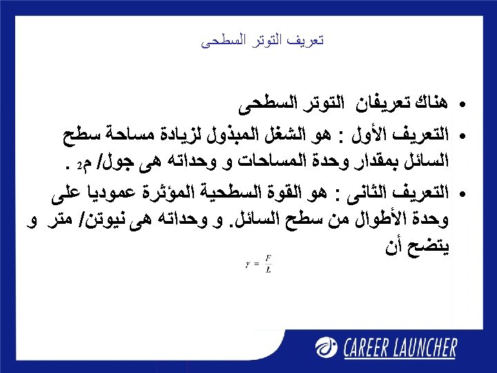 To keep the equilibrium, an equal force must be applied to oppose the inward tension in the surface. Thus SURFACE TENSION [γ ] is the force per unit length that must be applied parallel to the surface so as to counterbalance the net inward pull and has the units of dyne/cm INTERFACIAL TENSION is the force per unit length existing at the interface between two immiscible liquid phases and has the units of dyne/cm. Invariably, interfacial tensions are less than surface tensions because an adhesive forces, between the two liquid phases forming the interface are greater than when a liquid and a gas phase exist together. If two liquids are completely miscible, no interfacial tension exists between them. Greater surface tension reflects higher intermolecular force of attraction, thus, increase in hydrogen bonds or molecular weight 20 cause increase in ST