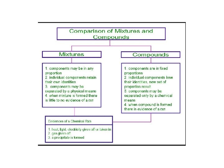 Compounds – composed of two or more different types of elements chemically bonded together • Compounds can only be separated into the elements that make up the substance by a CHEMICAL REACTION.