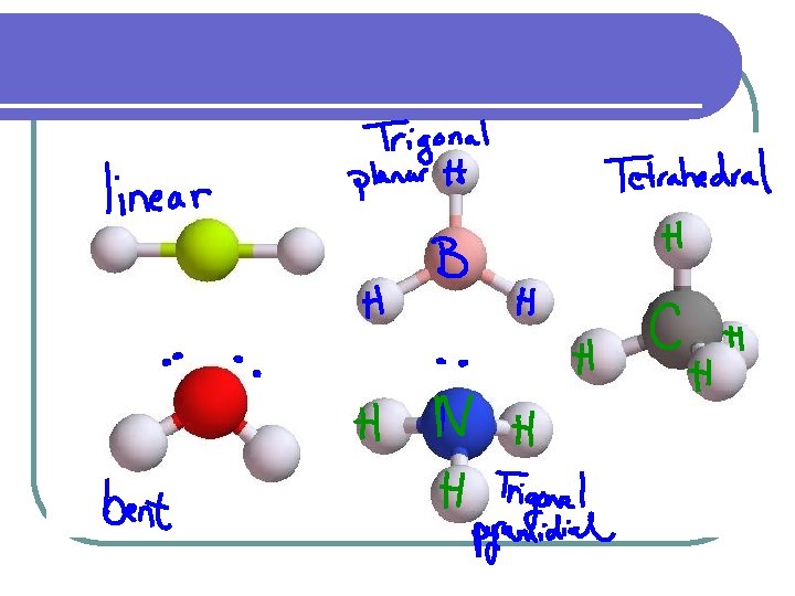 Shape Number of atoms on unshared Central atom pairs of electrons Linear Example H--Cl 2 0 O=C=O Trigonal 3 Planar Tetrahedral 4 0 H 2 CO 0 CH 4 Bent 2 2 H 2 O Trigonal Pyramidal 3 1 NH 3