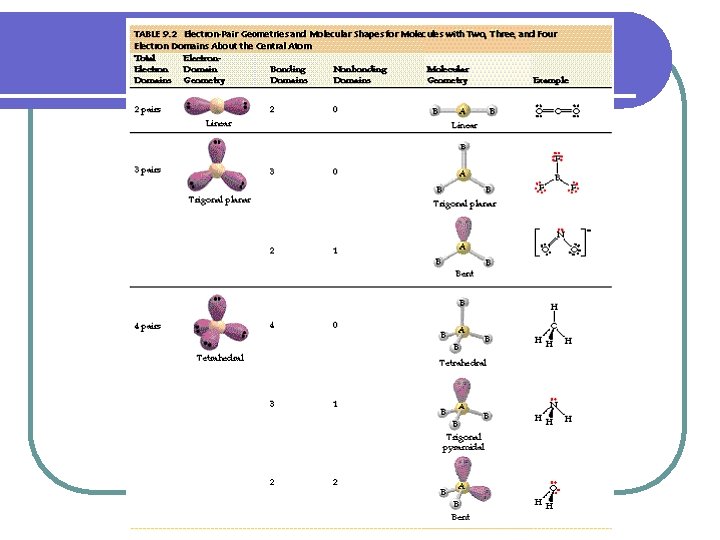Geometric Shape l VSEPR-valence shell electron-pair repulsion. l Since electrons repel each other, electron pairs will be as far apart as possible