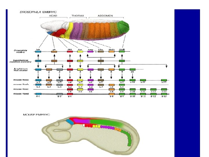 Implications • The homeobox regulatory gene clusters date to ancestors that predate the arthropod-vertebrate divergence ~600 million years ago • Humans and mice aren’t so different from flies in body-plan development