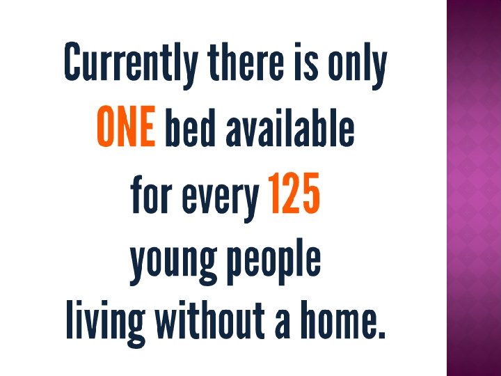 Ø Ø Ø Approximately 1. 7 million young people call the streets home every year. Nearly 20, 000 homeless people 24 years old and younger live in New York City. Children under 18 accounted for 39% of the homeless population. Of that number, approximately 42% were younger than age 5. Approximately 40% of homeless youth identify as LGBT. Every year, approximately 5, 000 homeless young people will die because of assault, illness, or suicide while trying to survive.