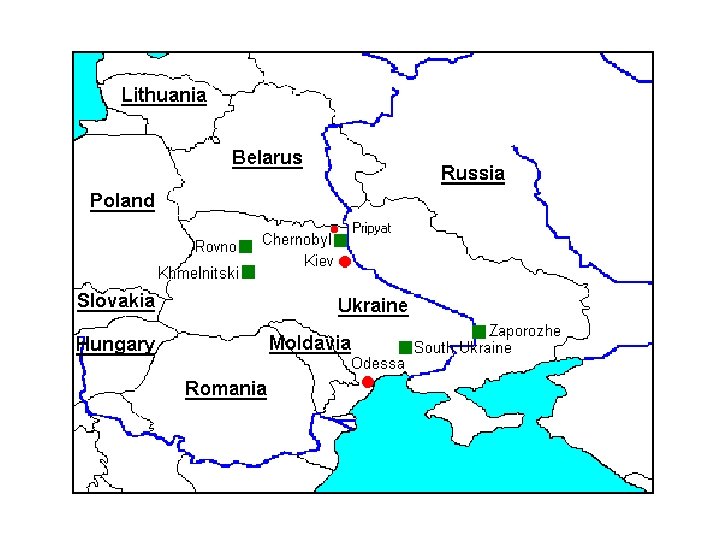 Chernobyl • Hot debris started fires on the roofs of other reactors • Steam and smoke were highly radioactive • No public notice was made until radiation alarms at a nuclear plant in Sweden went off! • The cloud spread over Russia, Belarus, Ukraine and Moldova, but also Turkish Thrace, the Southern coast of the Black Sea, Macedonia, Serbia, Croatia, Bosnia-Herzegovina, Bulgaria, Greece, Romania, Lithuania, Estonia, Latvia, Finland, Denmark, Norway, Sweden, Austria, Hungary, the Czech Republic and the Slovak Republic, The Netherlands, Belgium, Slovenia, Poland, Switzerland, Germany, Luxembourg, Italy, Ireland, France (including Corsica) the United Kingdom and the Isle of Man. • Reactor was contained in a concrete sarcophagus which has 200 tons of highly radioactive material inside • Entire plant shut down in 2000