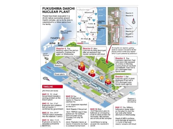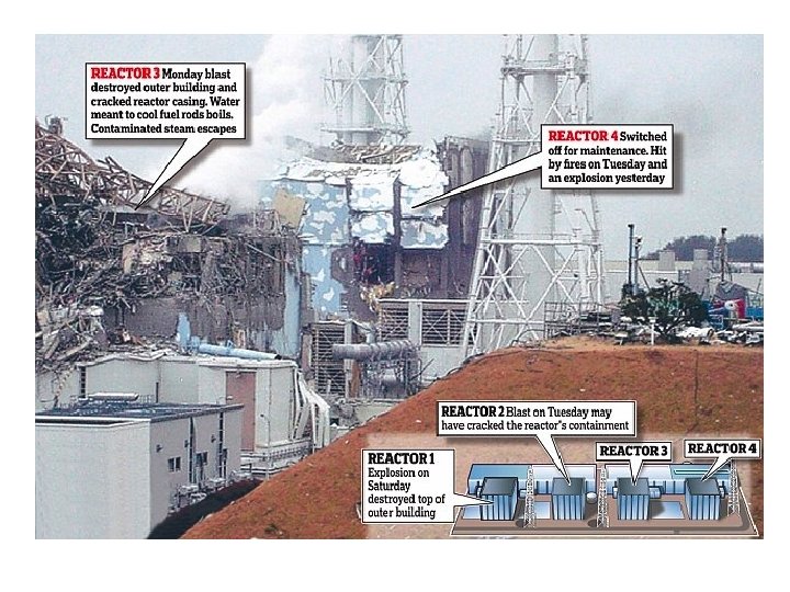 Fukushima Timeline • March 25 – Possible breaches in the containment buildings of Units 1, 2, 3 reported. • March 26 – Radiation levels of 10 million times normal in the Unit 2 turbine room were reported, but later found to be inaccurate. It was only 100, 000 times higher than normal. – Damage is now known to be: • Roof of reactor 2 damaged but intact • Reactor 3 roof is blown away • Walls of reactor 4 building have collapsed • Steam is emanating from reactors 2, 3, 4