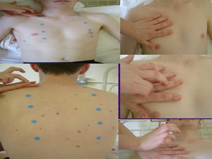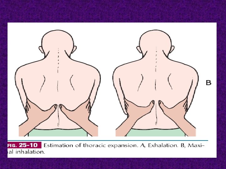 n n n 3) Symmetry and chest expansion: by placing your hands on the patient back with the thumbs together on the midline, ask the patient to breath deeply Normally the palms move equally 4) Swelling : normally absent 5) Tactile vocal fremitus: the palm of the right hand should be applied flat on the different zones of the chest while the child is asked to repeat the word(- ﺃﺮﺑﻌﺔ )ﺃﺮﺑﻌﺔ and compare both sides Normally the hand detect vibrations of equal intensity on both sides of the chest