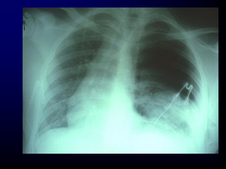 Tension pneumothorax • Tension pneumothorax is not an x-ray diagnosis - it MUST be recognized clinically • Treatment is decompression - needle into 2 nd intercostal space of mid-clavicular line followed by thoracotomy tube