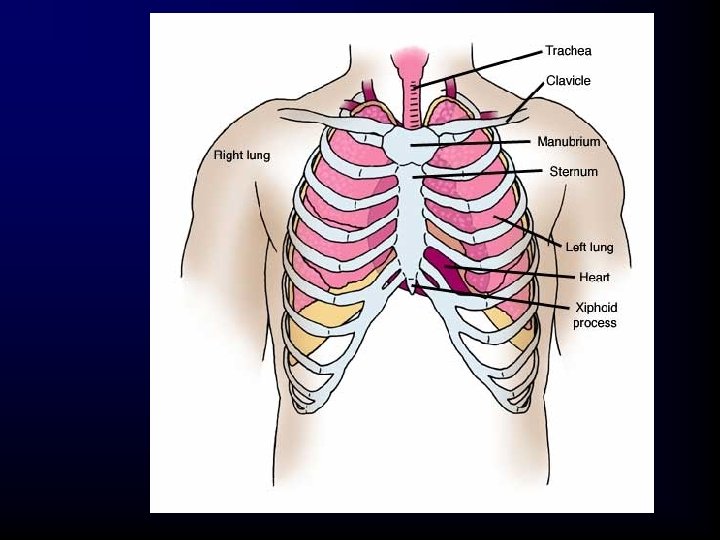 Anatomy • Mediastinum – The area between the lungs • • Heart Trachea Vena cavae Pulmonary artery Aorta Esophagus Lymph nodes