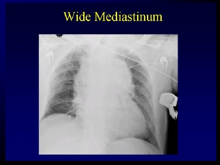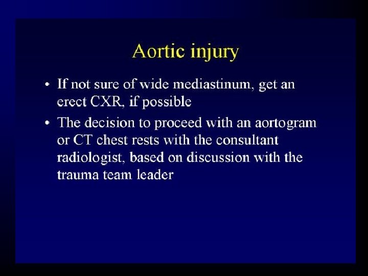 Chest Trauma – Initial Evaluation • Blunt trauma – Chest radiographs in blunt trauma patients are taken in the supine position, as unstable spinal fractures have not been ruled out at this stage. – Chest films should be slightly over-penetrated to allow better visualization of the thoracic spine, paraspinal lines and aortic outline.