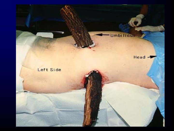 Chest Trauma – Initial Evaluation • Penetrating trauma – Patients with a stab wound that may have violated the thoracic cavity or mediastinum should have a chest X-ray. – In practice, this means all patients with stab wounds between the neck and the umbilicus (front or back!).