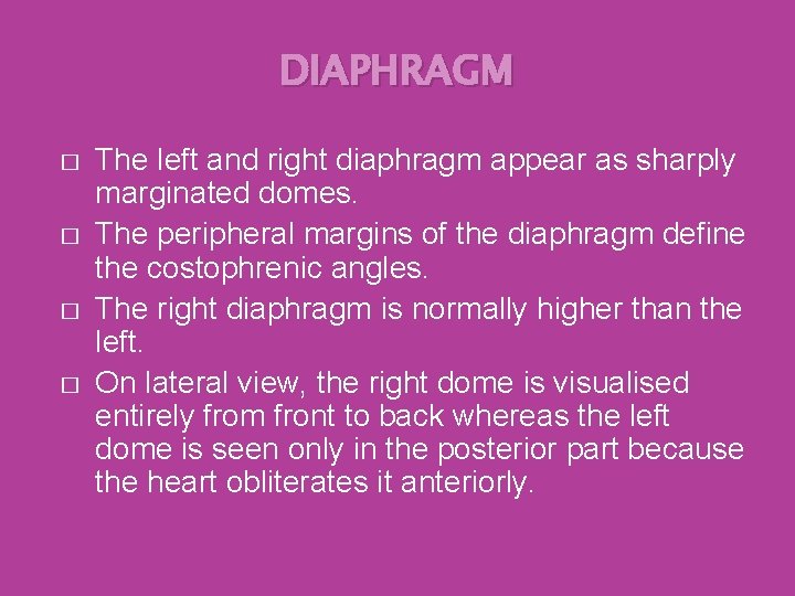 DIAPHRAGM � � The left and right diaphragm appear as sharply marginated domes. The peripheral margins of the diaphragm define the costophrenic angles. The right diaphragm is normally higher than the left. On lateral view, the right dome is visualised entirely from front to back whereas the left dome is seen only in the posterior part because the heart obliterates it anteriorly.
