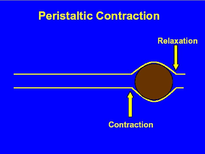 Three types of peristalsis: Primary peristaltic wave: Originate in pharynx Vagus control through Myenteric plexus Secondary peristalsis: Primary peristalsis fails-retained food initiates secondary peristalsis wave Vago- vagal reflux Tertiary peristaltic wave: Irregular and localized