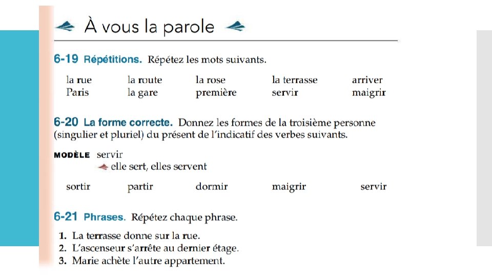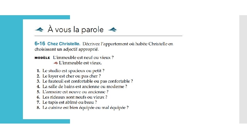 Répondez aux questions en utilisant un pronom d’objet direct: Tu prends cet appart’? Oui, je le prends. Vous attendez le bus? Oui, nous l’attendons. Ils visitent l’appartement? Oui, ils le visitent. Vous avez les CDs? (non) Non, nous ne les avons pas. Vous voulez voir le film? Oui, nous voulons le voir. Elle a garé la voiture? Oui, elle l’a garée. Elle aime les voisins? (non) Non, elle ne les aime pas. Il a fait ses devoirs? Oui, il les a faits! Vous pouvez finir le livre? Oui, nous pouvons le finir.