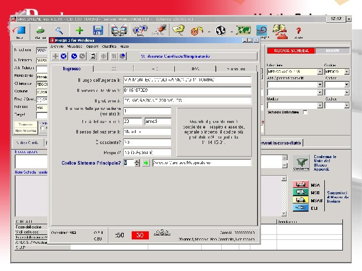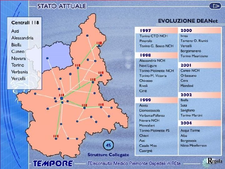 Gestione di Sistemi a Copertura Geografica: 3 reti in area medica ed emergenza su tutto il territorio di Piemonte e Valle d’Aosta Rete Gestione Emergenza 118 Rete Ospedaliera di Teleconsulenza Rete Osservatori Statistici per patologie specifiche 8 Centrali 118 37 Ospedali collegati per teleconsulenza 166 Centri di Trattamento Patologie oltre 2000 utenti