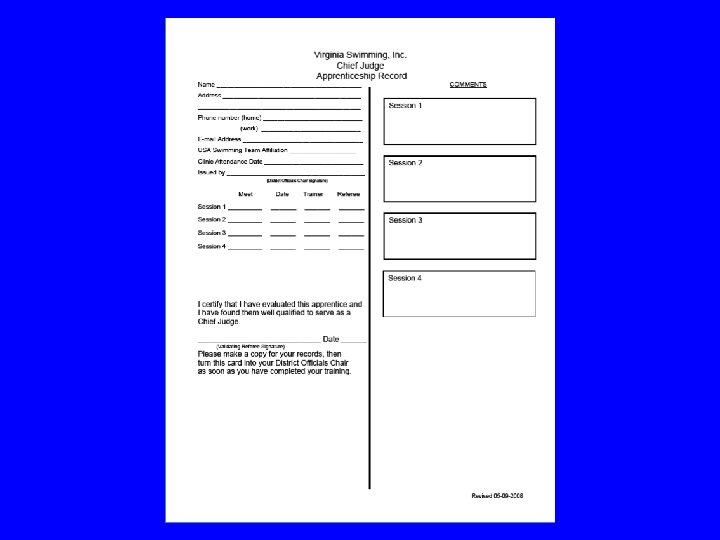 Chief Judge Certification Requirements (cont) • On-the-Job Training & Initial Certification • Complete a minimum of four sessions of training at VSI-sanctioned swim meets with positive recommendations from the Trainer and Meet Referee. • Individuals currently certified as Referees may certify by attending a training clinic. • The District Officials Chairperson will issue a certification card upon the satisfactory completion of all the training requirements.