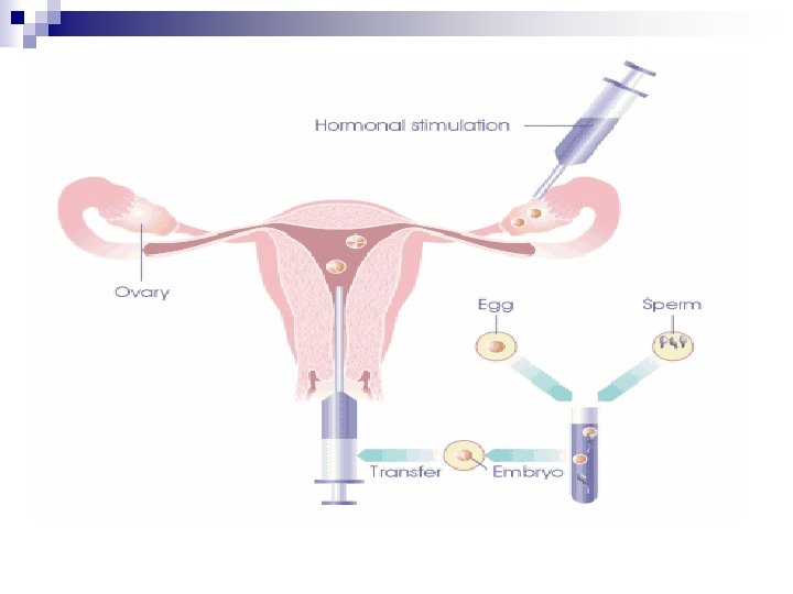 Human Reproduction n (IVF) In-vitro fertilization- ovum(egg) are removed from the woman’s body and fertilized with sperm in a lab. The embryo is surgically implanted into her uterus.