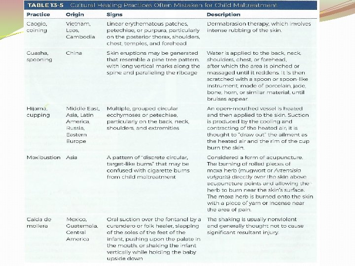 Intentional Trauma Screening (continued) �RED Flags radiologic findings �Metaphyseal fractures (corner fractures) �Rib fractures (especially posterior) in infants �Any fracture in a non-ambulating infant �Undiagnosed healing fracture �Subdural hematoma and/or subarachnoid hemorrhage or neuroimaging in young children, particularly in the absence of skull fracture (children younger than 1 year)