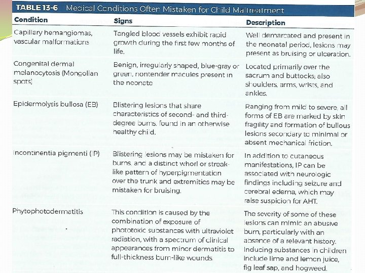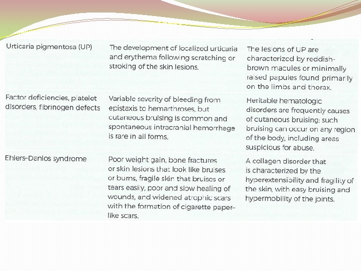 Bruises �Most common �Raise level of suspicion if not in areas as a result of exploring �Mnemonics TEN-4 -FACES for suspicious bruising �Torso �Ear �Neck �Frenulum �Auricular of the ear �Cheek �Eyelid �Sclera �YOUNGER THAN 4 years