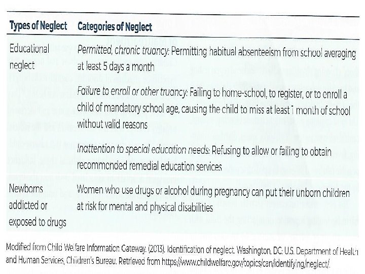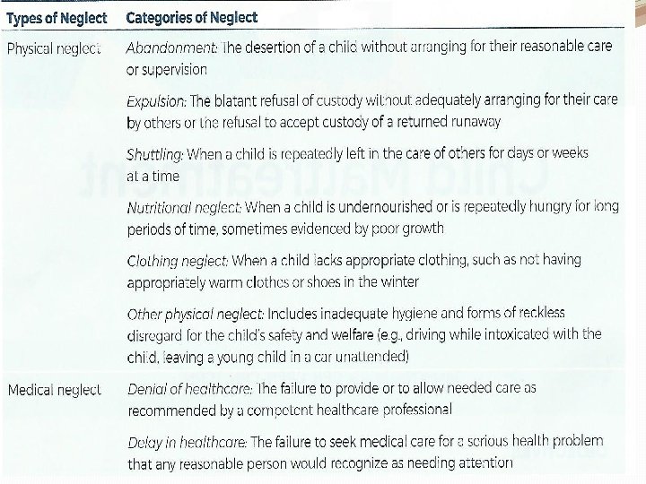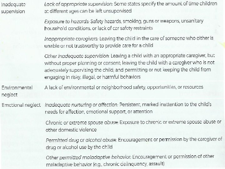 Neglect �Most common �Failure to provide for child’s basic physical, emotional, or educational needs or to protect a child from harm or potential harm �Neglected children do not learn how to develop coping abilities and tend to be overly dependent and unhappy �Tend to develop criminal behavior, personality disorders, substance abuse, and stressful life events