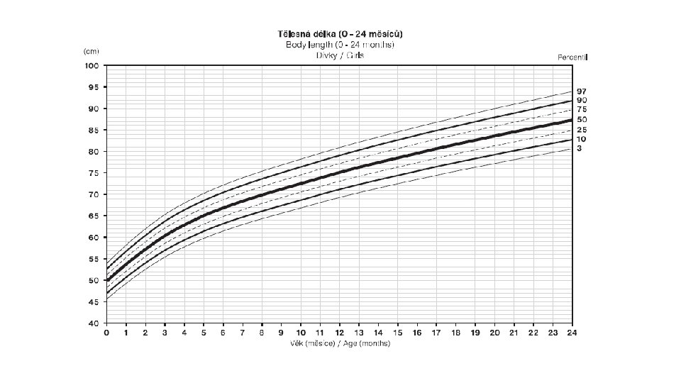 What are they for? • growth examinationby GP • underweight/overweightclassification in children • alert that „something is happening“ • charts available in CZ • height, weight/height ratio, BMI • circumferences – hips, waist, head, arm • skinfolds – biceps, triceps, thigh, subscapular, suprailiacal, 2 -skinfold sum, 4 -skinfold sum Childhood hygiene Growth charts 96