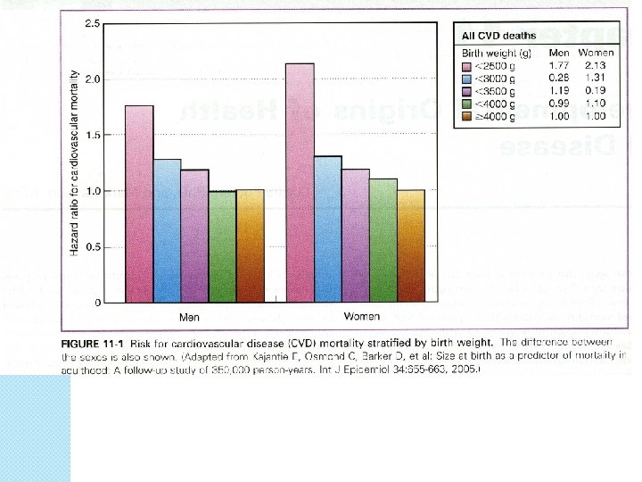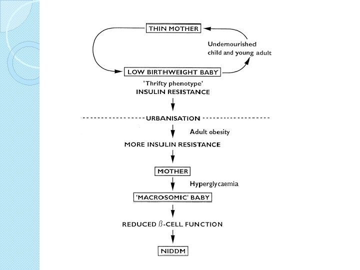 Barker Hypothesis Based on medical archives from Preston, Hertfordshire, and Sheffield, England 16, 000 men and women born in Hertfordshire, 1911 - 1930: ● 2 -fold increase in coronary heart disease from largest to smallest BW ● Impaired GT increased from 14% to 40% Barker, et al Clin Sci 1998; 115: 118