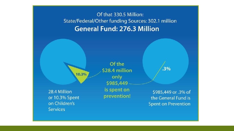 RESULTING PRIORITIES FOR 0 -5 YEAR OLDS Prenatal / Postnatal - Home Visitation • Case Management • Lactation Consulting • From Birth for At-Risk Families Family Strengthening – Home Visitation • Parent Coaching and Mentoring • Child Development Education • Parenting Strategies • Life Skills • Job Readiness Skills Quality Childcare / Preschool