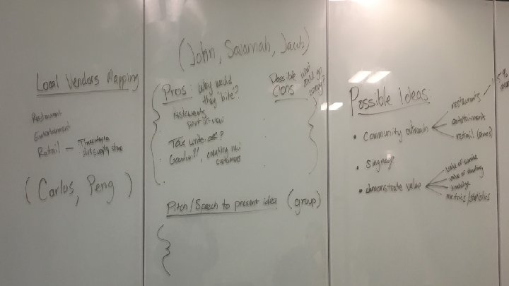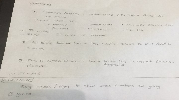 Brainstorming Focused on community outreach local businesses. involving Concentrated on businesses most relating to Children’s museum such as restaurants, art supply stores and retail stores. Came up with four main ideas.
