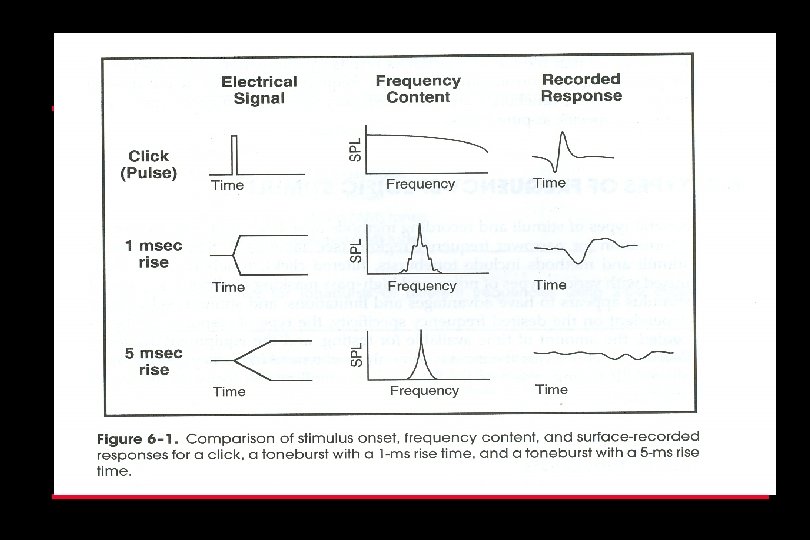 What We Know About ABR Clicks l Click commonly used, but……can give misleading information Click has energy at all frequencies transduced by earphone l Within limits, regions of normal hearing will generate ABR, even with regions of hearing loss l ABR tests avoid problems associated with reverse middle ear transmission, but potential still exists for missing hearing loss with click-evoked ABR l