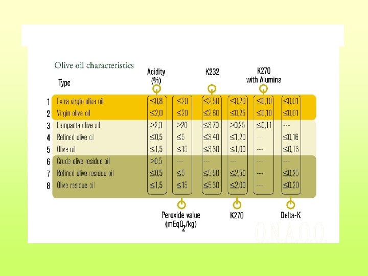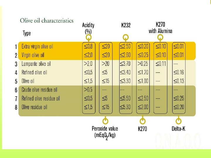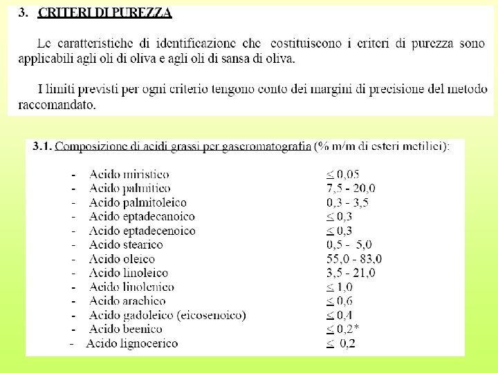 I riferimenti di legge relativi ai metodi analitici e ai limiti legali sono contenuti nel regolamento UE n. 2568/91 del 11 -7 -91, L 248 e successive modifiche. Le definizioni aggiornate della classificazione degli oli di oliva si trovano nel regolamento CE n. 1513/01 del 23 -7 -01, L 201.