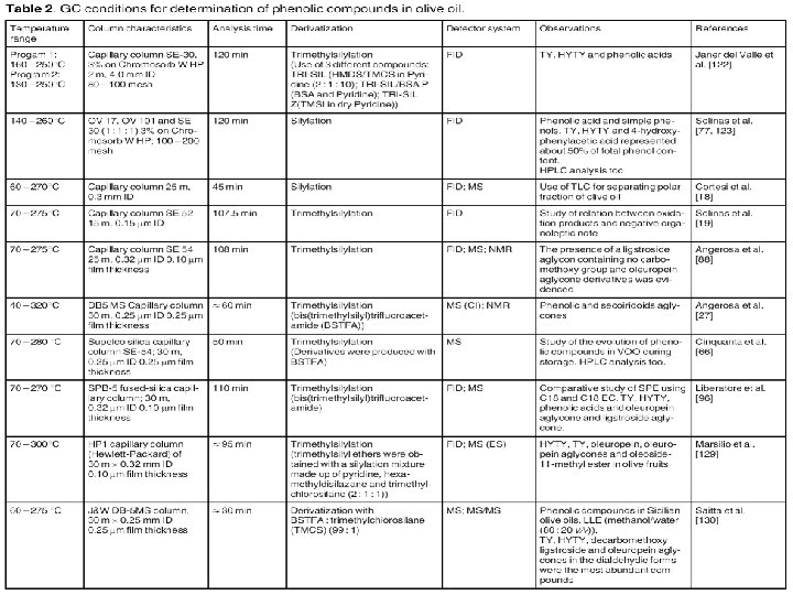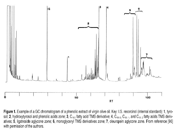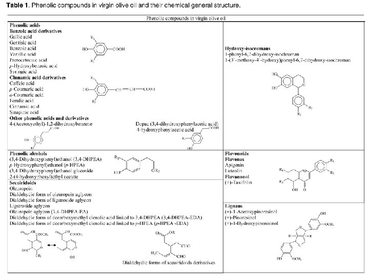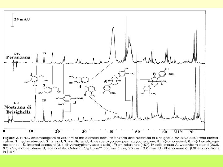 Fenoli I composti fenolici sono presenti nell’olio di oliva in quantità variabili (50 – 700 mg/Kg) e hanno un importante ruolo per quanto riguarda: • la stabilità del prodotto • caratteristiche di salubrità • sapore La composizione fenolica dipende da: • cultivar • stadio di maturazione, inoltre è influenzata da: • processo di molitura • condizioni e tempi di conservazione.