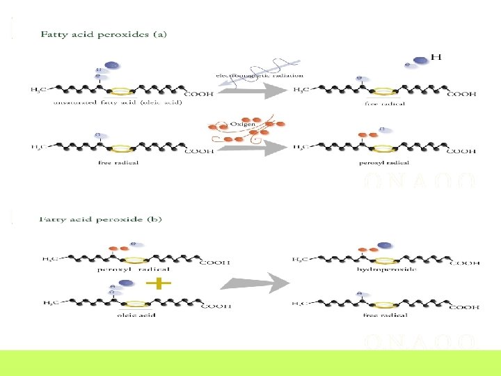 Il numero di perossidi I perossidi si formano a causa di reazione di ossidazione indotte dall’ossigeno disciolto nell’olio in presenza di altri fattori contemporaneamente presenti come ad esempio i pigmenti (clorofille e feofitine), oppure metalli che agiscono da catilizzatori. In particolare si possono distingure due tipi di ossidazione: L’auto-ossidazione e la foto-ossidazione. In entrambi i casi si giunge alla formazione di perossidi. Il meccansimo di formazione dei perossidi passa attraverso la generazione di un radicale libero da parte di un acido grasso insaturo che reagendo con una molecola di ossigeno froma il radicale perossidico. Questo reagisce con un altra molecola di acido grasso fromando un idroperossido (autoossidazione). Nel caso della fotoossidazione la radiazione UV attiva una molecola di pigmento (clorofilla) che inizia il processo di ossidazione utilizzando l’ossigeno disciolto nell’olio. I metalli favoriscono l’ossidazione, ma senza il contributo della radiazione UV, la presenza di sostanze come i polifenoli, i tocoferoli, il beta-carotene si oppongono efficaciemente alla propagazione dell’ossidazione.