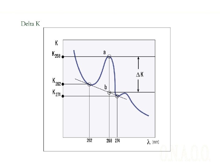 Analisi spettrofotometrica nell’UV Questo test consiste nel misurare l’assorbanza di un campione di olio, diluito in opportuno solvente, in un certo range di radiazione e di valutare tre paramentri (K 232, K 270, ΔK). Il valore K 232 è proporzionale alla concentrazione di dieni coniugati, mentre il valore di K 270 è proporzionale alla concentrazione di trieni coniugati. Inoltre composti di ossidazione di dieni coniugati concorrono al valore di K 232, mentre composti di ossidazione secondaria (aldeidi, chetoni) contribuiscono al valore di K 270. Durante l’analisi se il valore di K 270 supera il valore limite, il campione viene passato su allumina (per eliminare i composti di ossidazione secondaria) e misurato nuovamente. Il ΔK è il risultato di un calcolo. In passato era utilizzato come indice di purezza, oggi si preferisce considerarlo un indice di invecchiamento. Il valore di ΔK aumenta proporzionalmente ai fenomeni di ossidazione