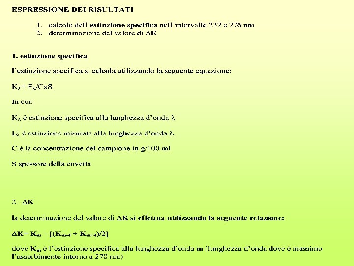 PROCEDIMENTO Il campione in esame deve essere perfettamente omogeneo ed esente da impurezze sospese. Gli oli liquidi a temperatura ambiente si filtrano su carta alla temperatura di circa 30°, i grassi concreti vengono omogeneizzati e filtrati a temperatura superiore di non oltre i 10°C alla temperatura di fusione. Del campione così preparato si pesano esattamente circa 0. 25 g in un matraccio tarato da 25 ml, si porta a volume con il solvente e si omogeneizza. La soluzione risultante deve essere perfettamente limpida. Qualora si riscontri opalescenza o torpidità, si filtra rapidamente su carta. Con la soluzione ottenuta si riempie una cuvetta e si misurano le estinzioni, usando come riferimento il solvente, alle lunghezze d’onda significative comprese tra 232 e 276 nm.