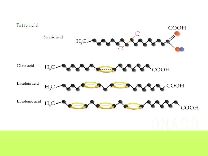 Acidi grassi Gli acidi grassi sono costituiti da catene di carbonio in numero da 4 a 30 con uno o più gruppi carbossilici (-COOH). Gli atomi di carbonio sono uniti a formare una catena generalmente attraverso un singolo legame C-C. I due atomi di carbonio possono essere legati anche attraverso un doppio legame (C=C). Nel caso in cui non siano presenti doppi legami l’acido grasso è definito saturo (ad esempio il palmitico e lo stearico). Se è presente un doppio legame è definito monoinsaturo (ad esempio l’acido oleico); se sono presenti due o più doppi legami è detto polinsaturo (acido linoleico, acido linolenico).